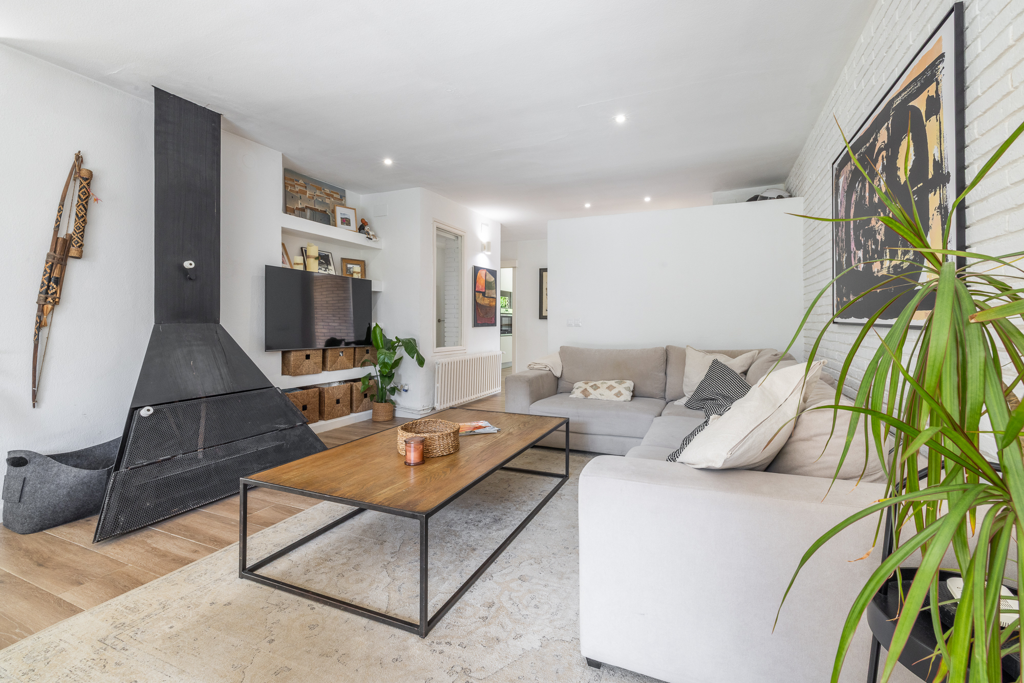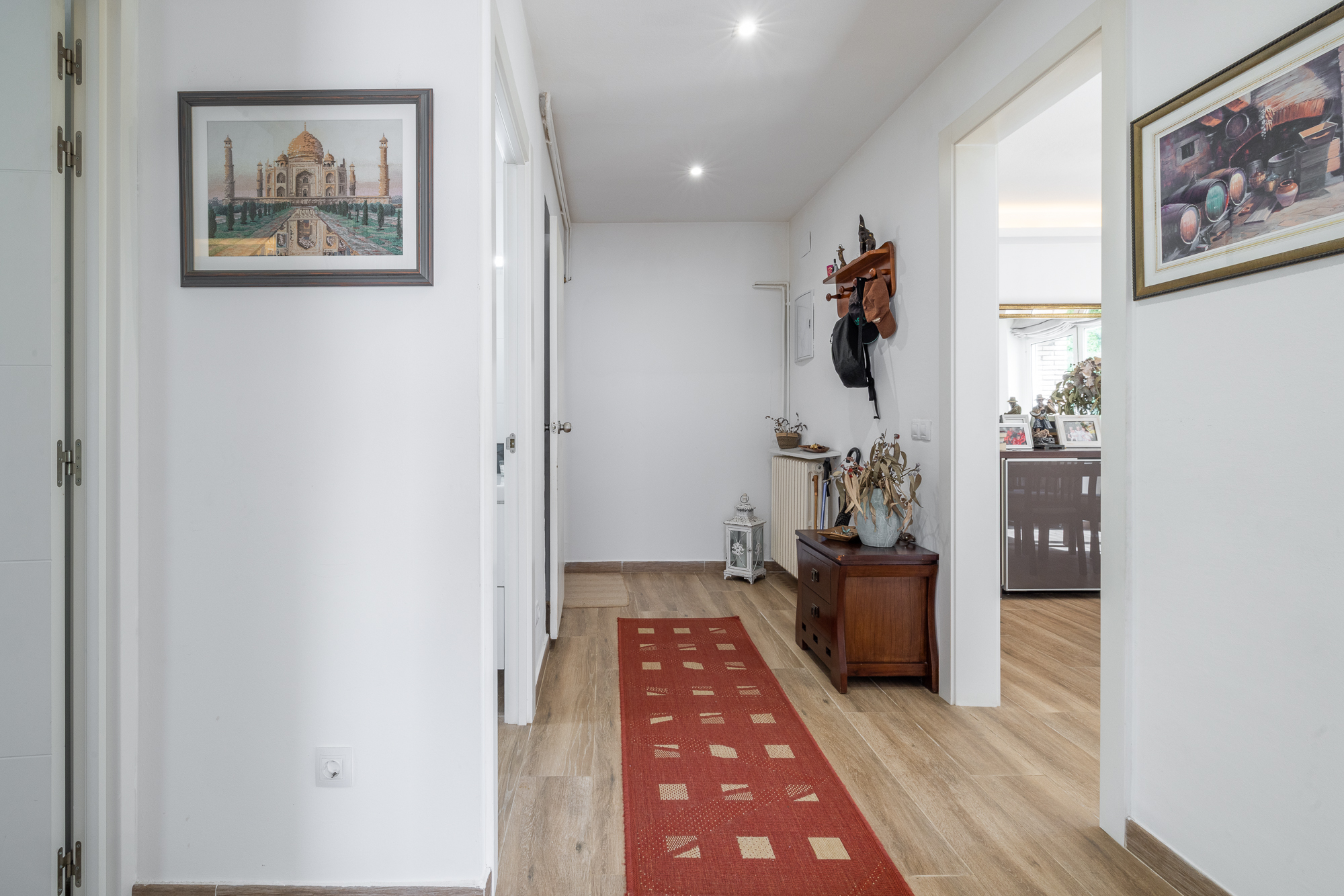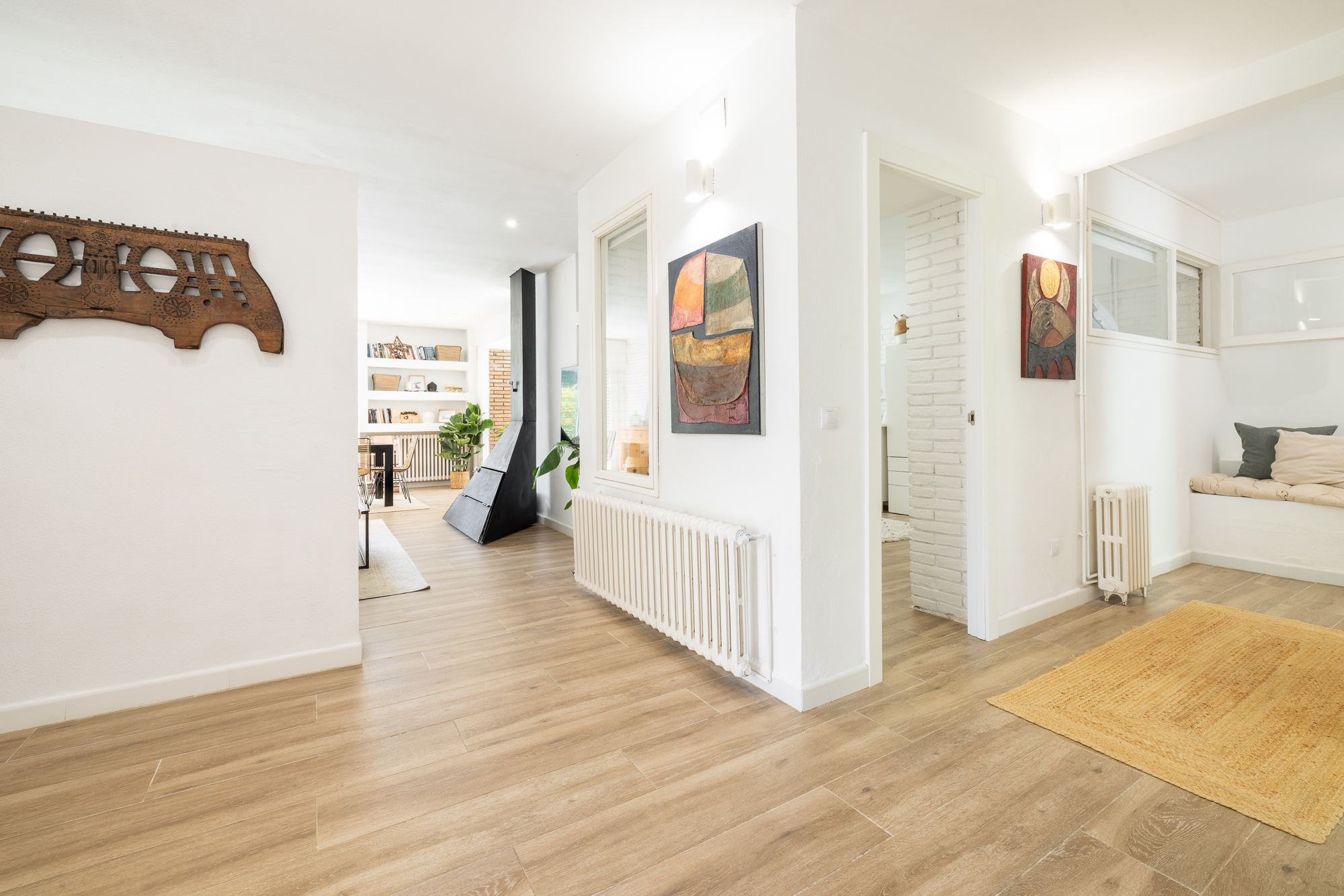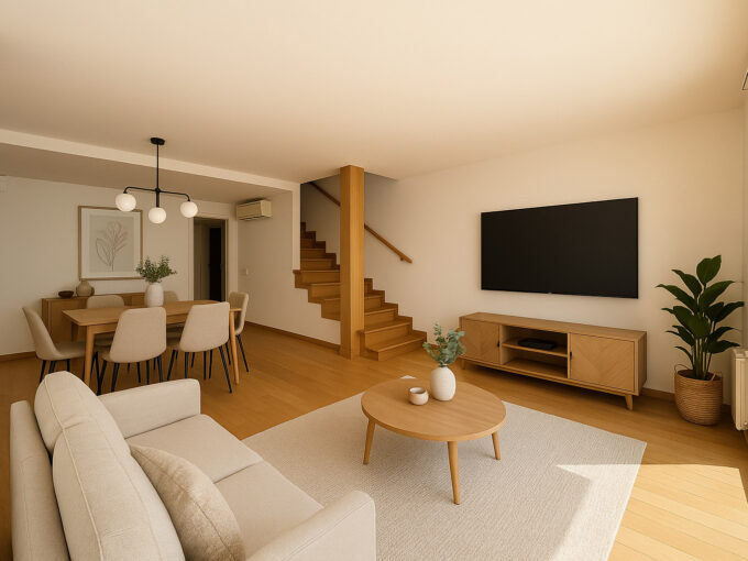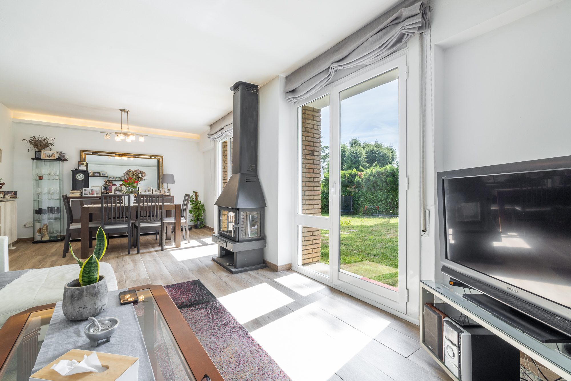 La vivienda nos recibe con un amplio y luminoso recibidor que anticipa el carácter cálido y contemporáneo de toda la casa. A ccedemenos desde la entrada al salón , espacioso y muy luminoso, y a una zona de despacho o zona polivalente con acceso directo al jardín, ideal para disfrutar del exterior desde el corazón del hogar.