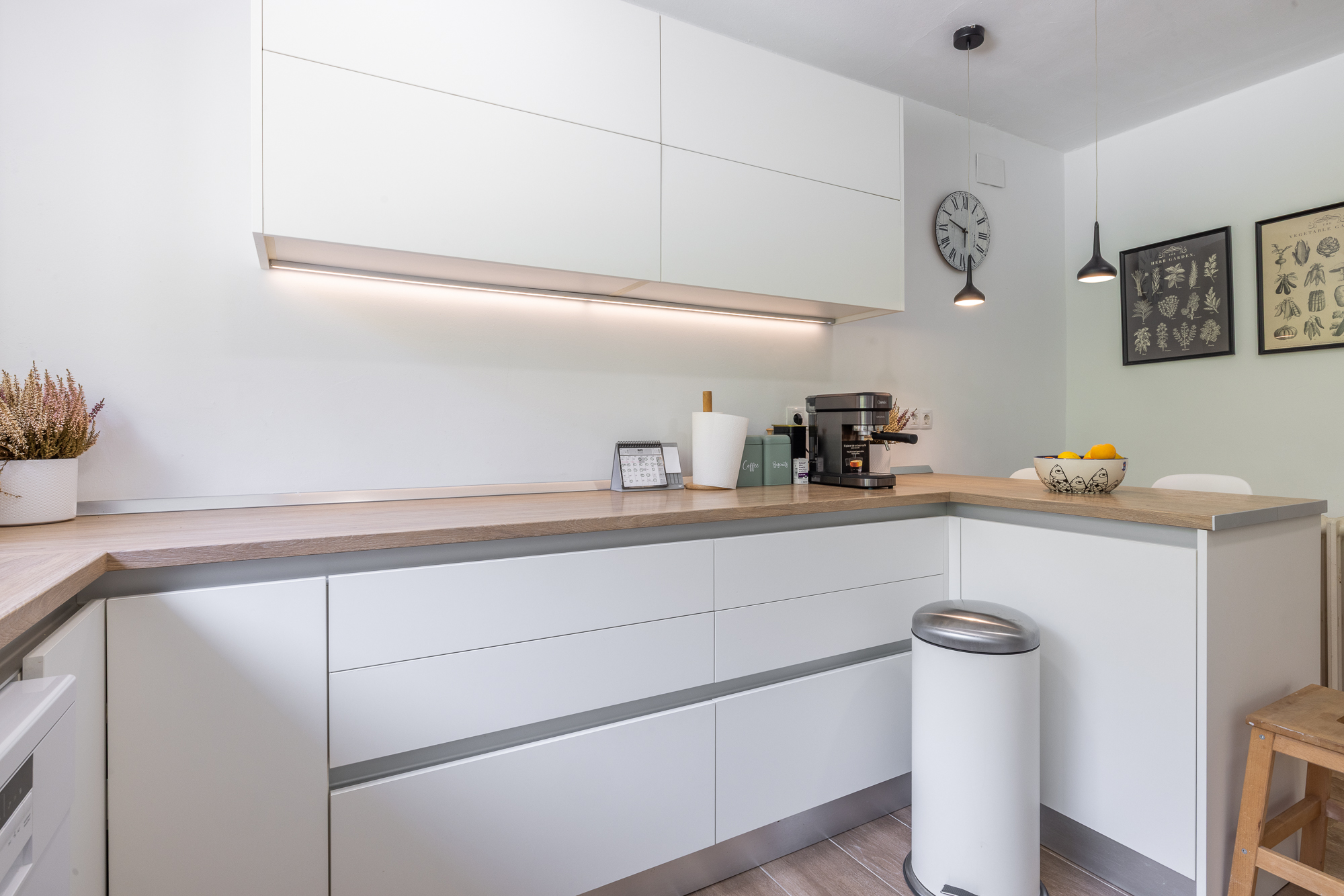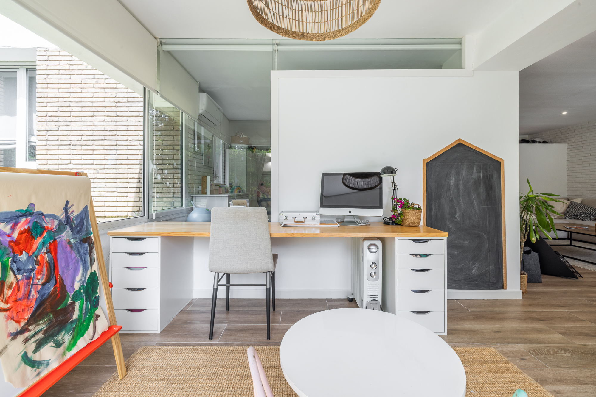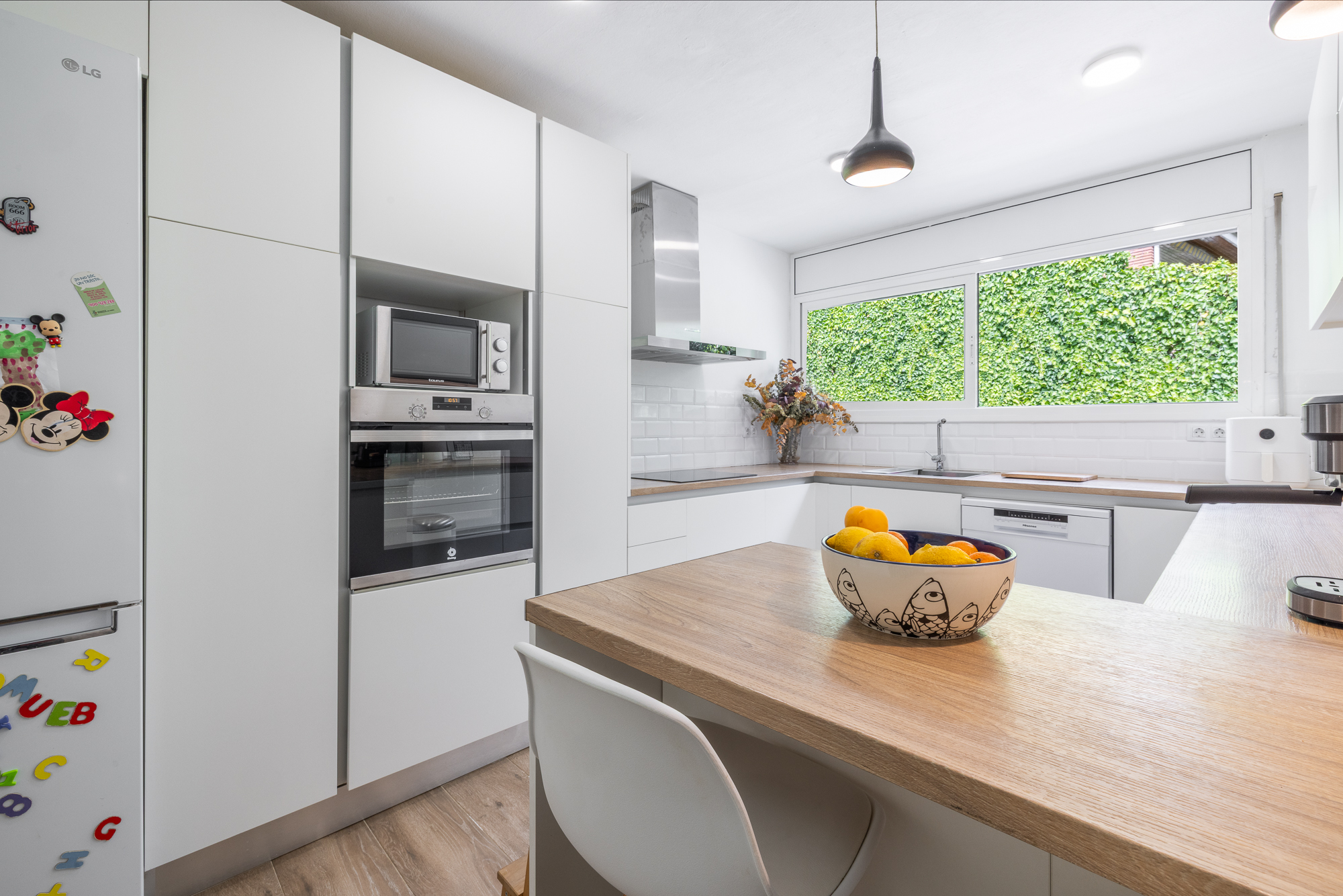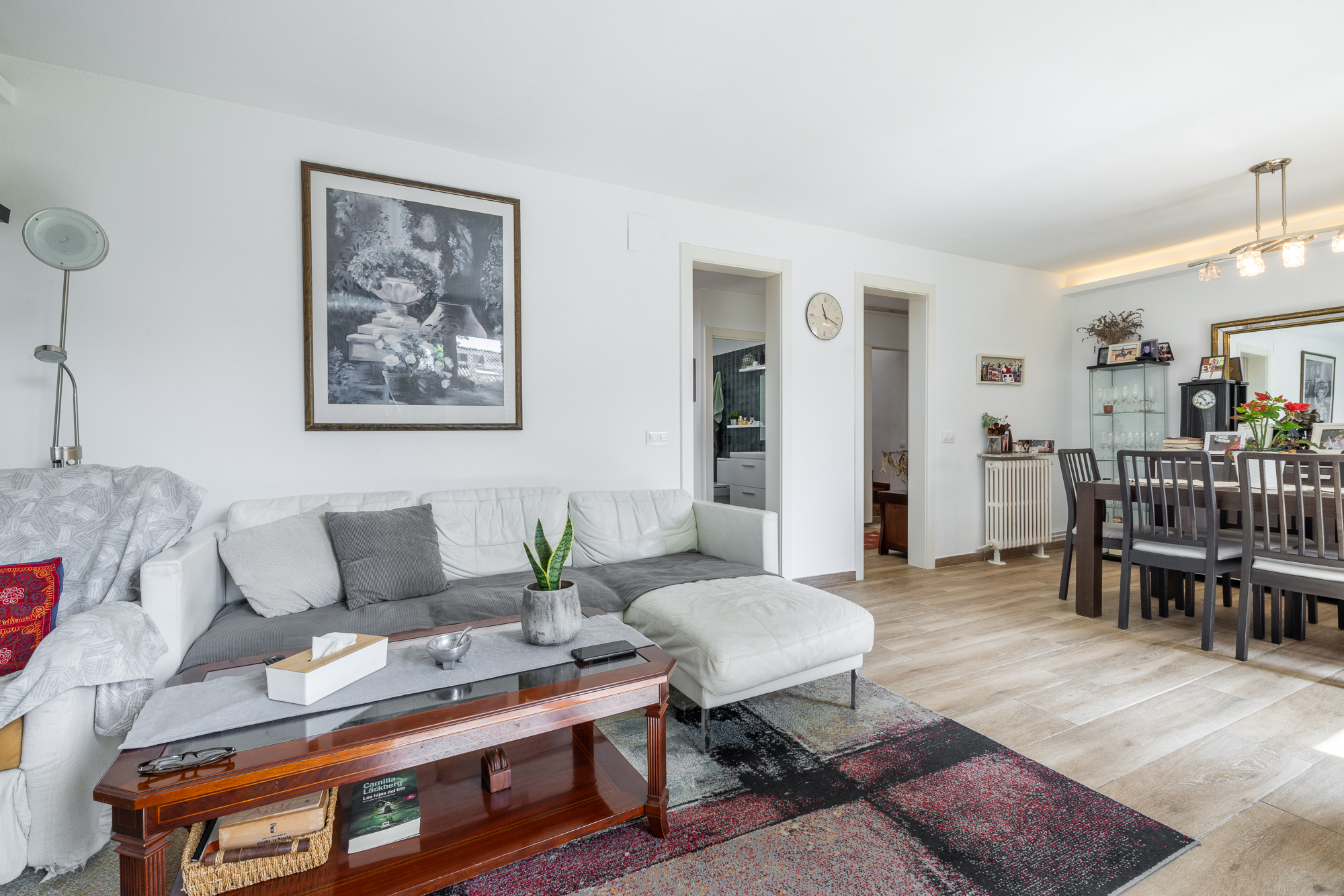 La vivienda nos recibe con un amplio y luminoso recibidor que anticipa el carácter cálido y contemporáneo de toda la casa. A ccedemenos desde la entrada al salón , espacioso y muy luminoso, y a una zona de despacho o zona polivalente con acceso directo al jardín, ideal para disfrutar del exterior desde el corazón del hogar.