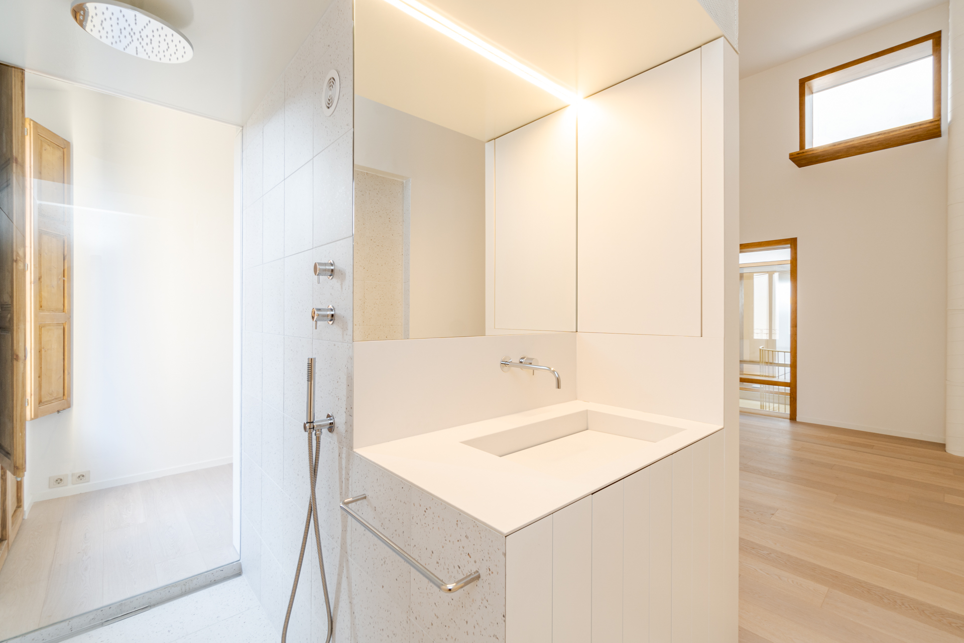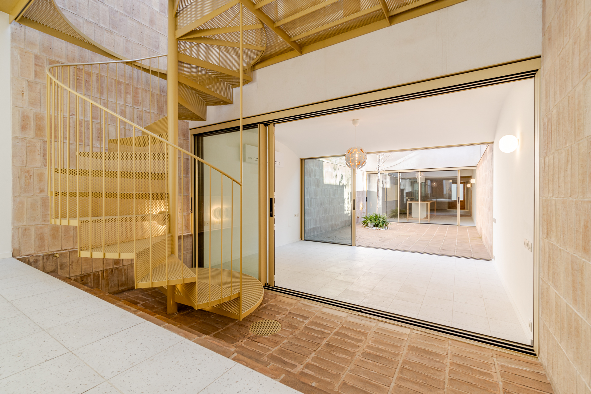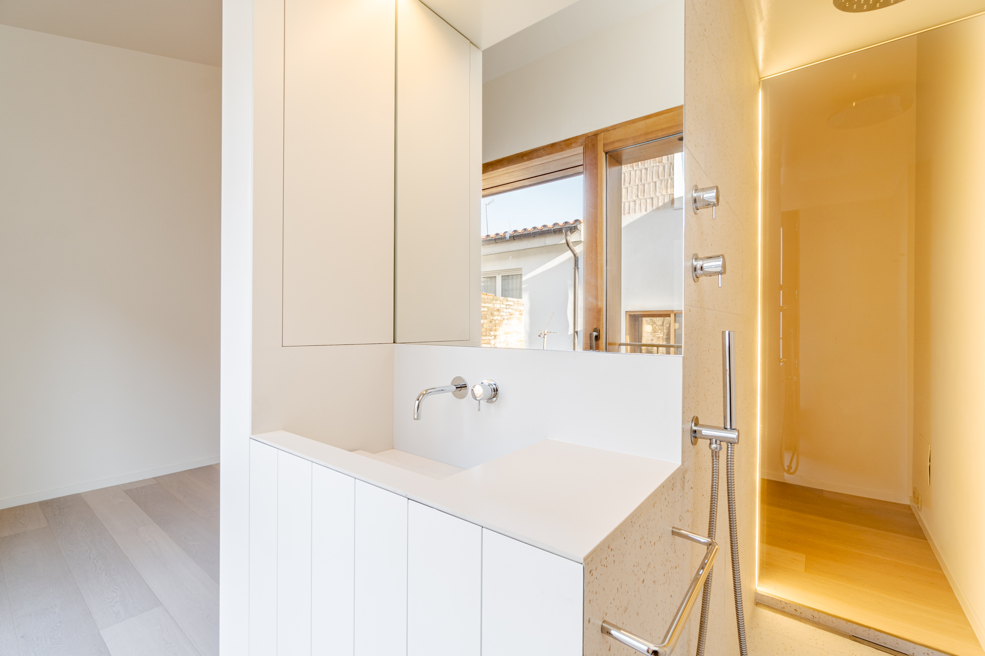 Antes de llegar al patio, mediante unas únicas escaleras de diseño accedemos a la planta superior de la vivienda y encontramos dos habitaciones dobles y en suite con baño completo de dos piezas y plato de ducha.