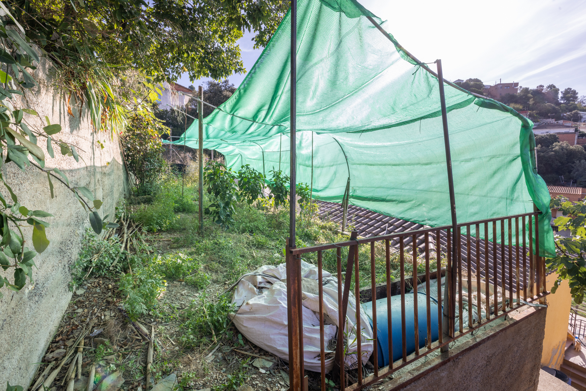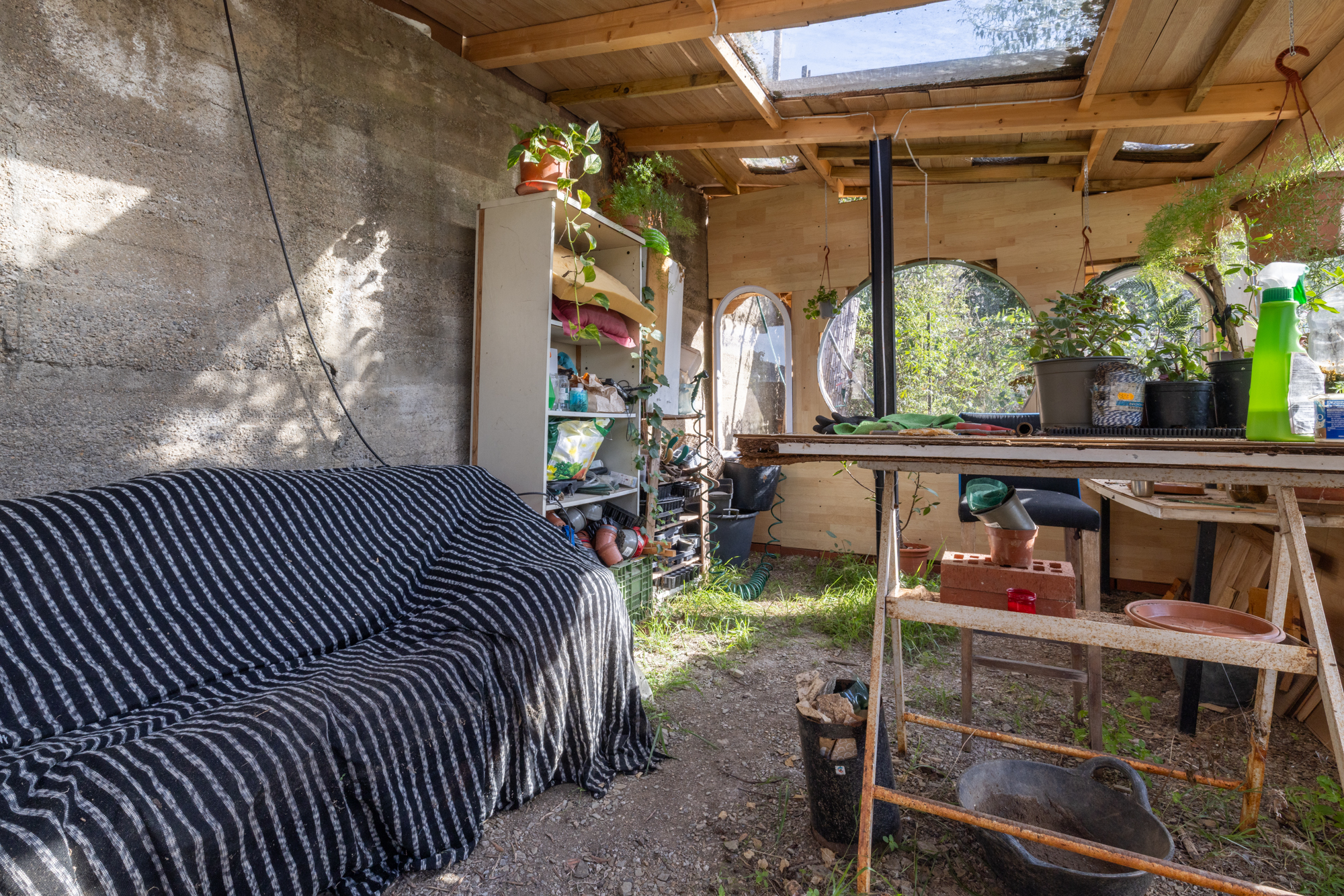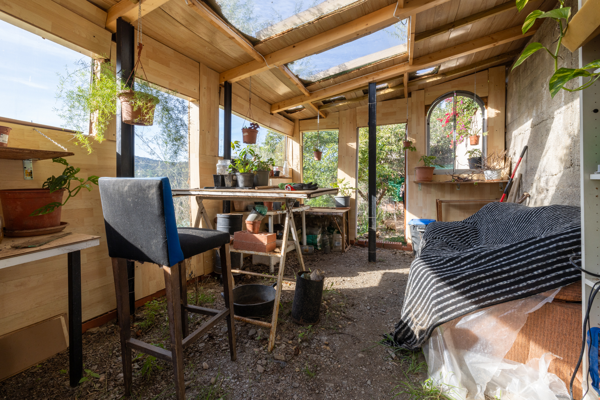 El solar se divide en cinco zonas diferenciadas: tres de ellas destinadas a invernadero, barbacoa y huerto, mientras que en la parte central se encuentra la vivienda principal.