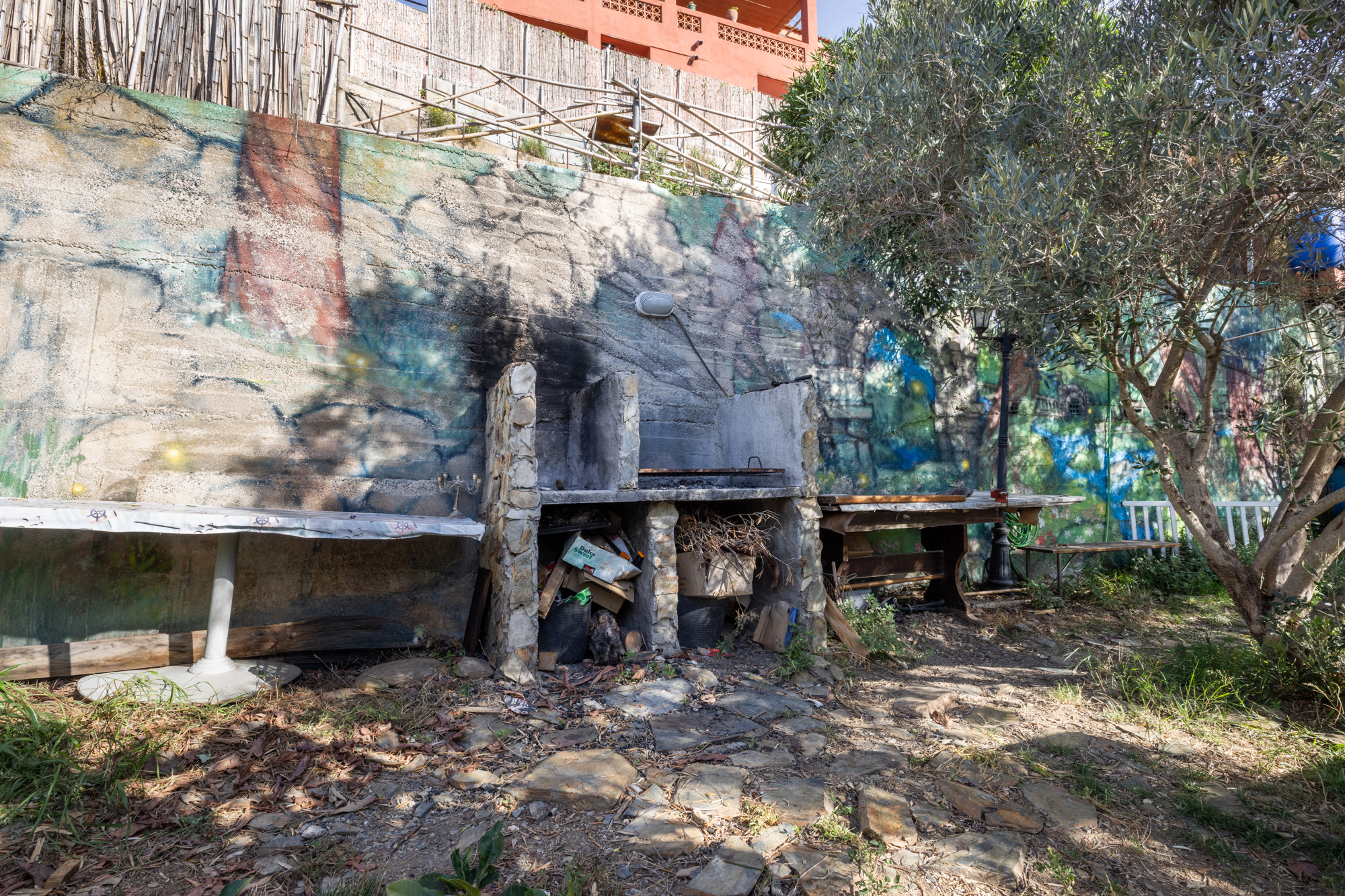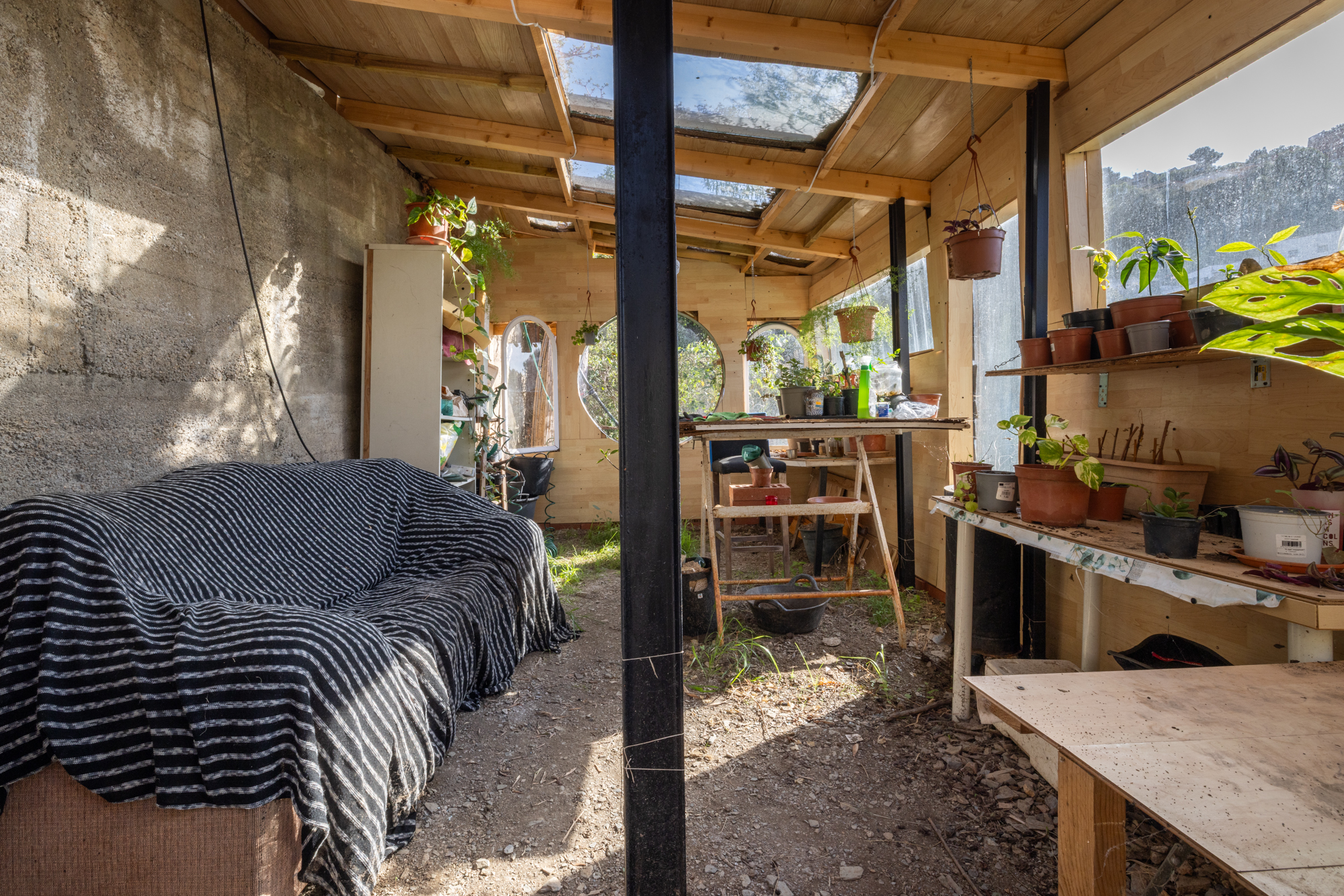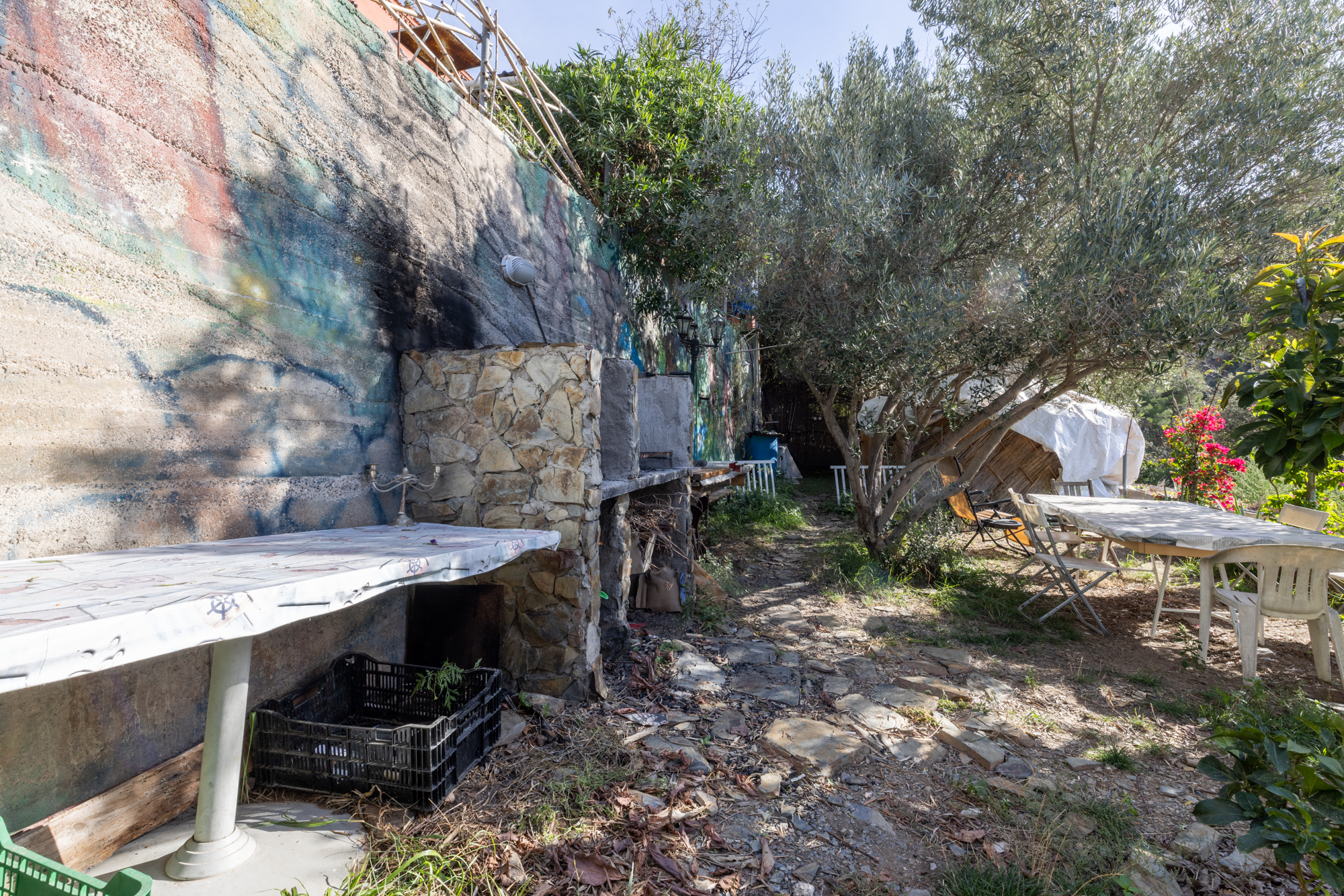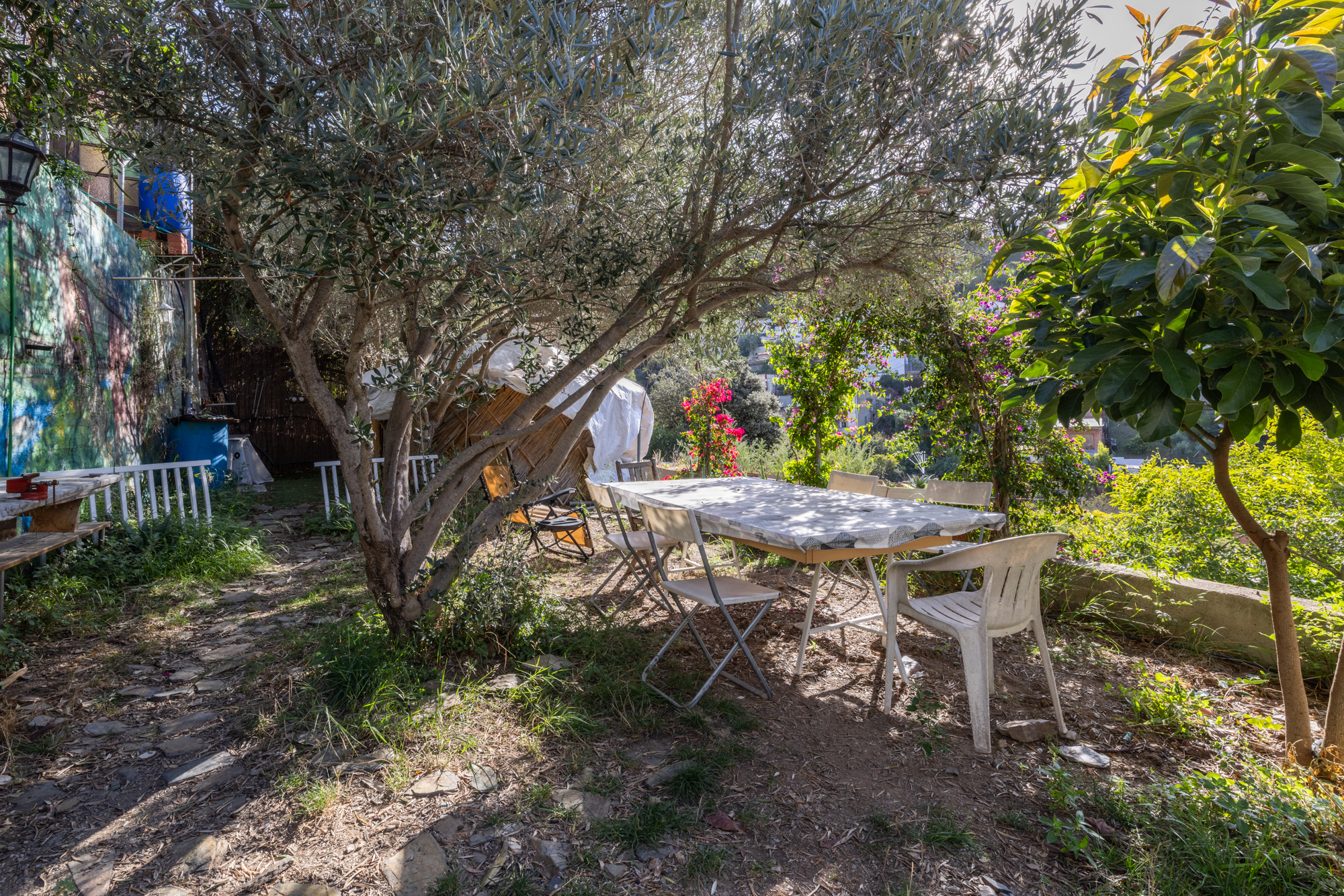 El solar se divide en cinco zonas diferenciadas: tres de ellas destinadas a invernadero, barbacoa y huerto, mientras que en la parte central se encuentra la vivienda principal.