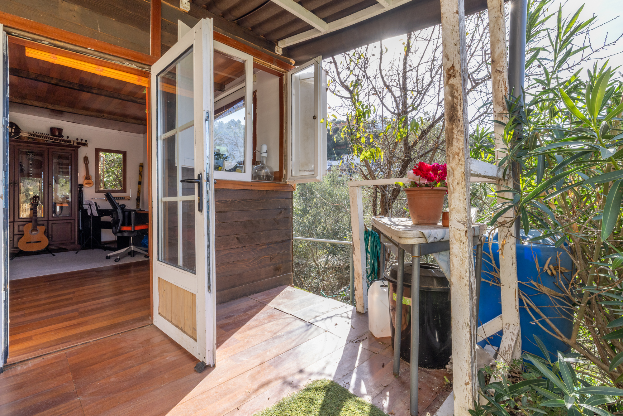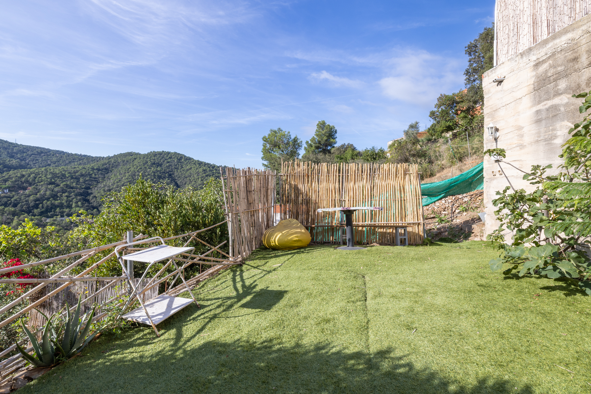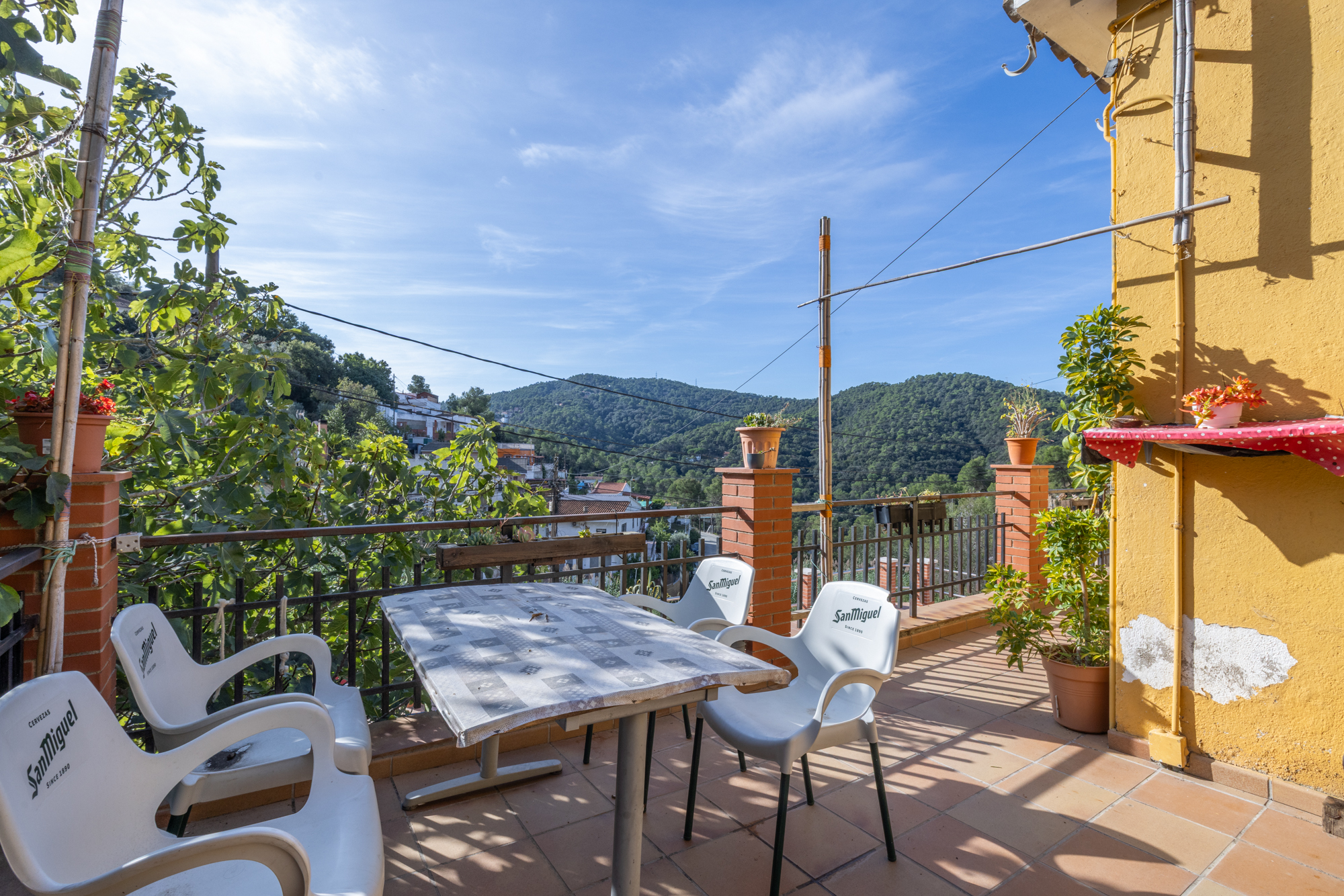 La vivienda dispone además de dos amplias terrazas: una en planta, ideal para disfrutar del sol y las comidas al aire libre, y otra frente a la casa, con vistas abiertas a la montaña. En la parte superior del inmueble se encuentra una acogedora casita tipo despacho, perfecta como zona de trabajo o estudio, con mucha luz natural y vistas panorámicas impresionantes.