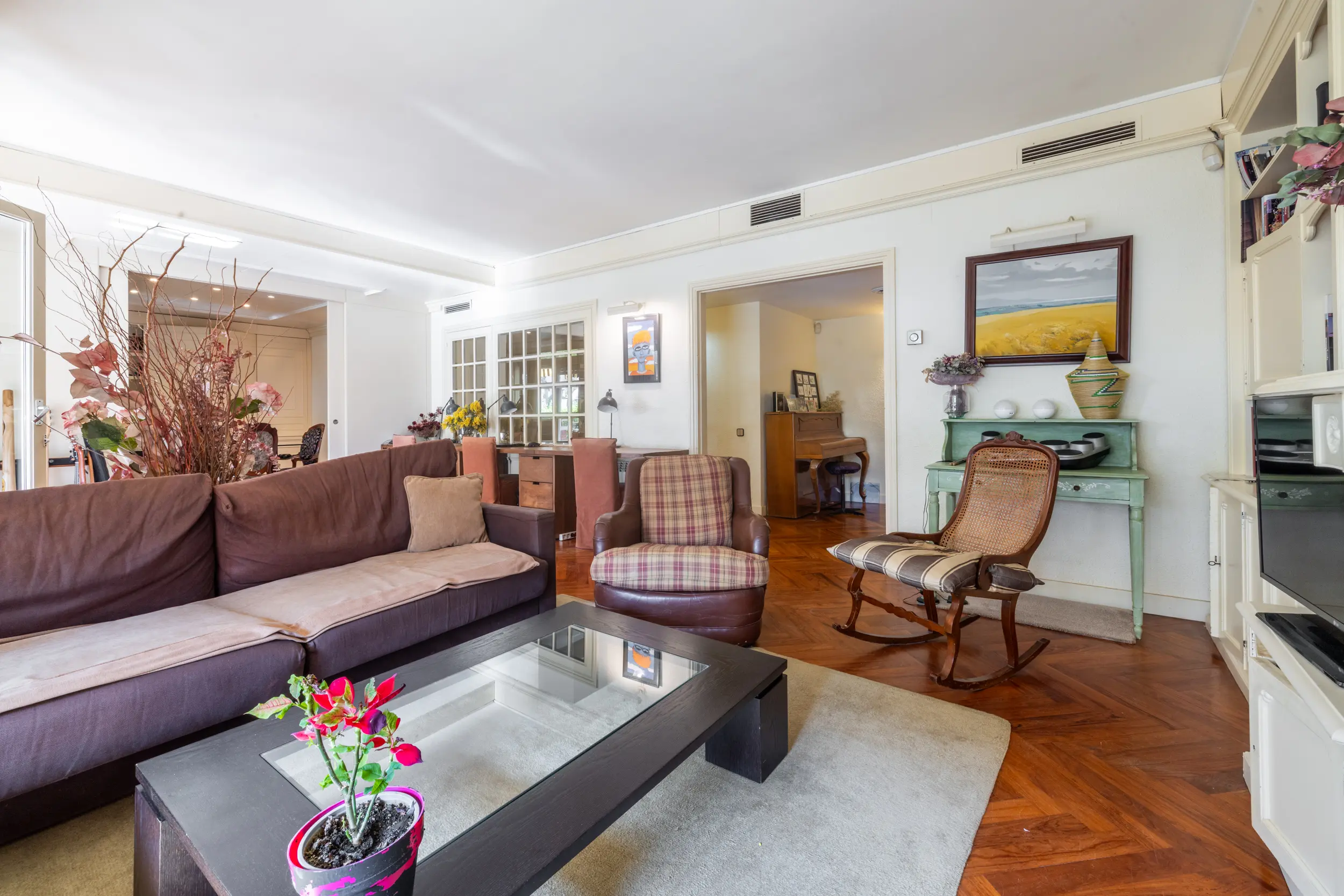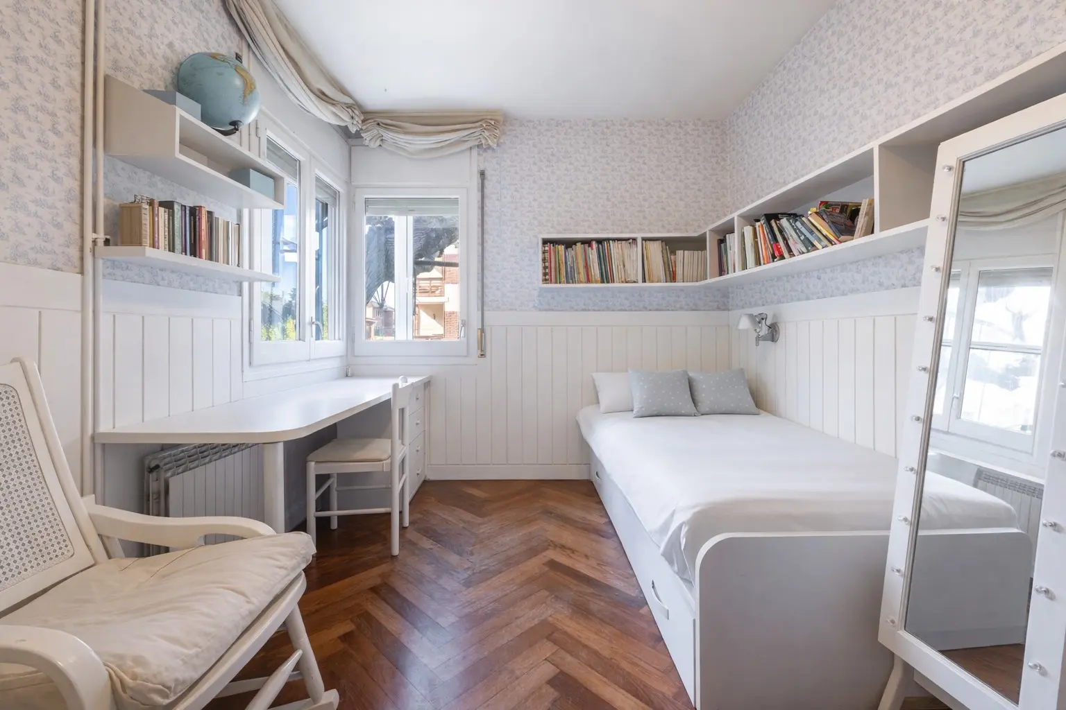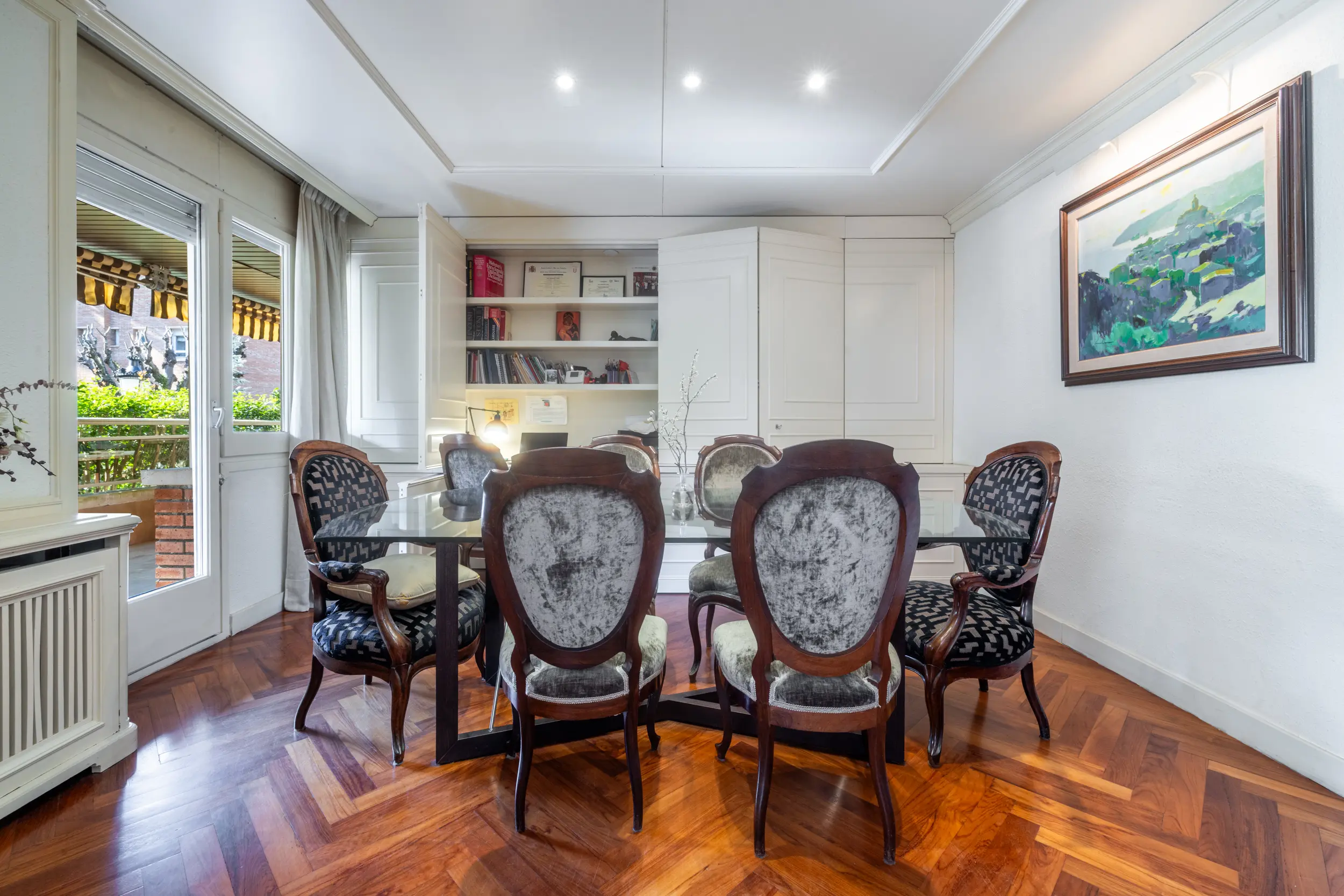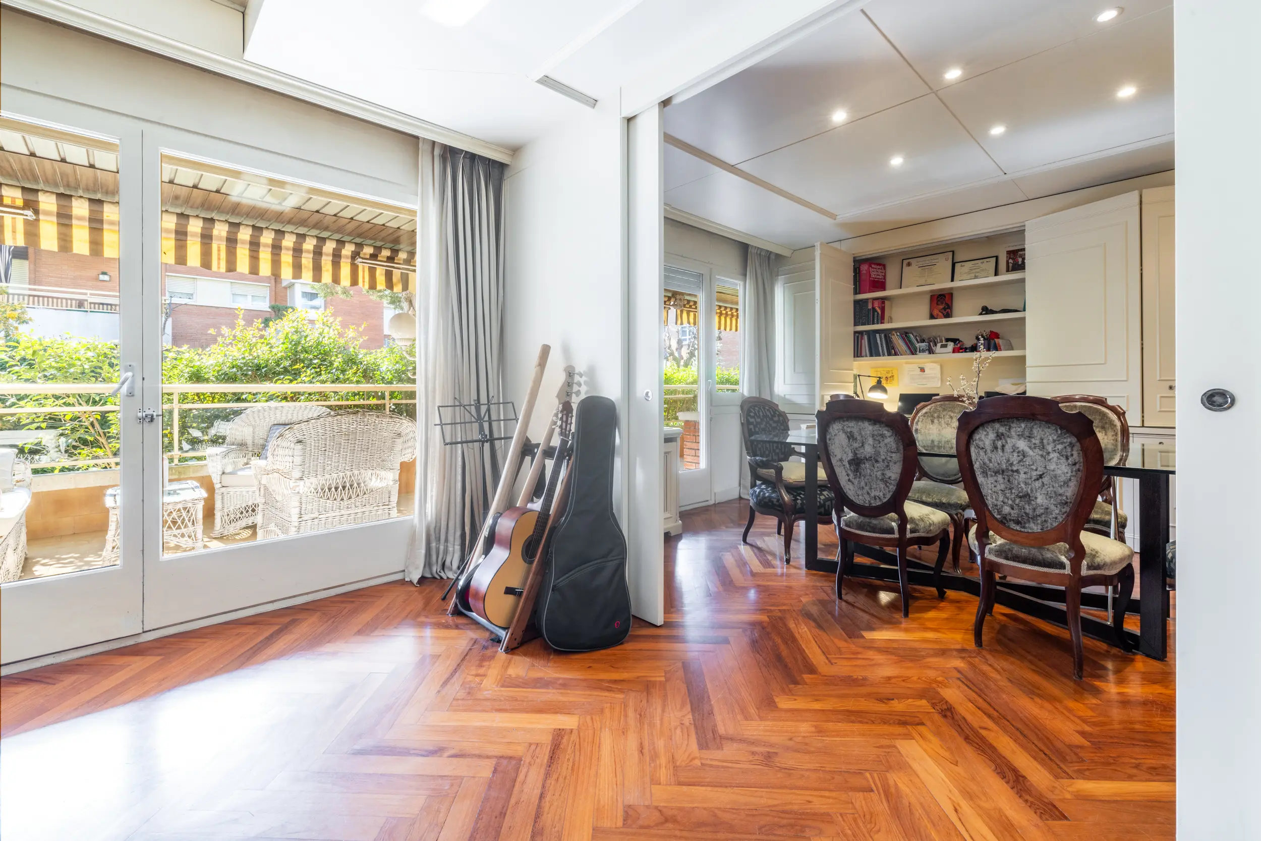 Actualmente dispone de tres amplias habitaciones dobles, además de un espacio adicional ideal como despacho o habitación individual. Originalmente la vivienda contaba con cuatro habitaciones, pero una de ellas se ha integrado en el comedor creando una zona de comedor independiente y cerrada, aportando mayor amplitud a la zona de día. No obstante, este espacio puede recuperarse fácilmente como cuarta habitación si se desea.