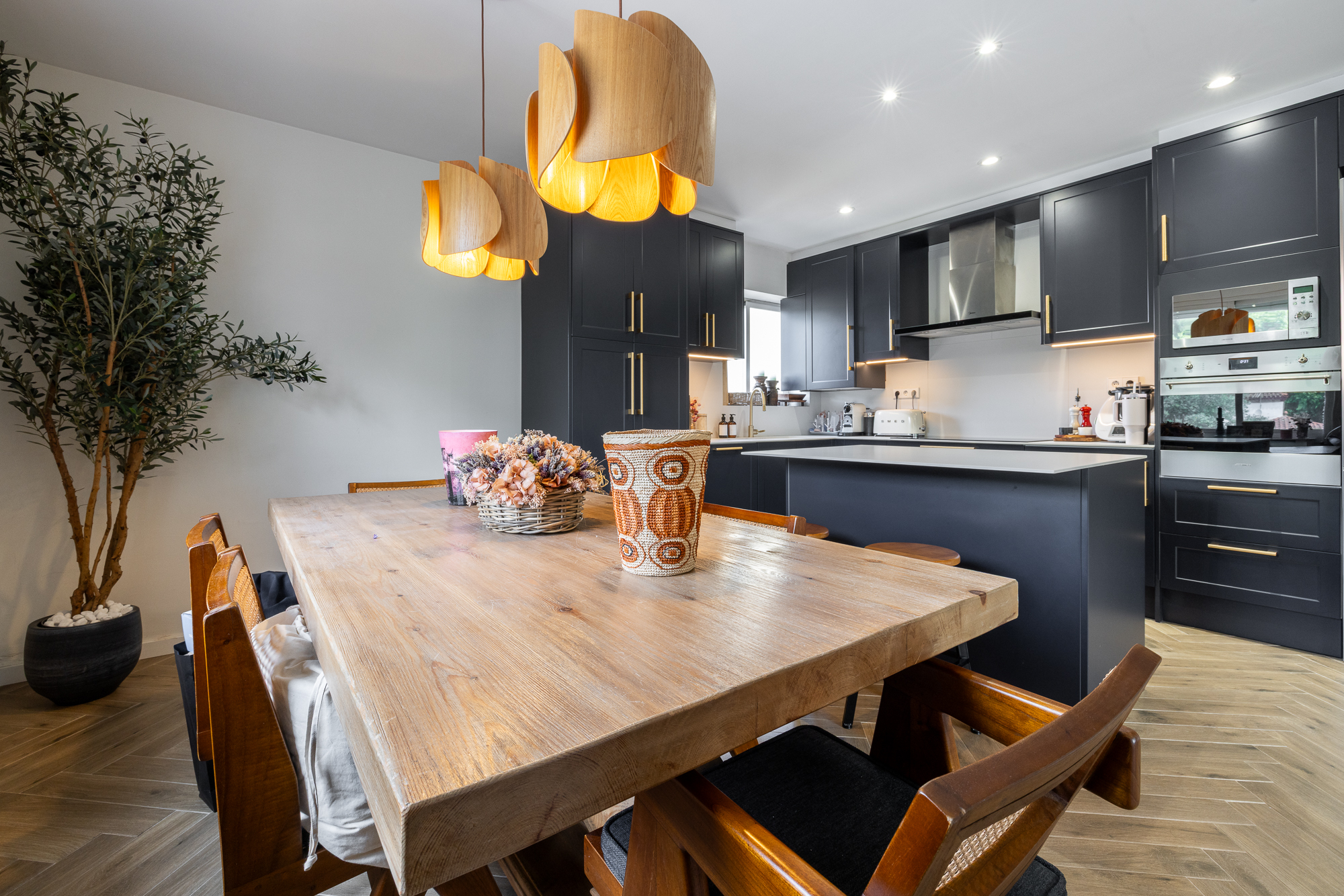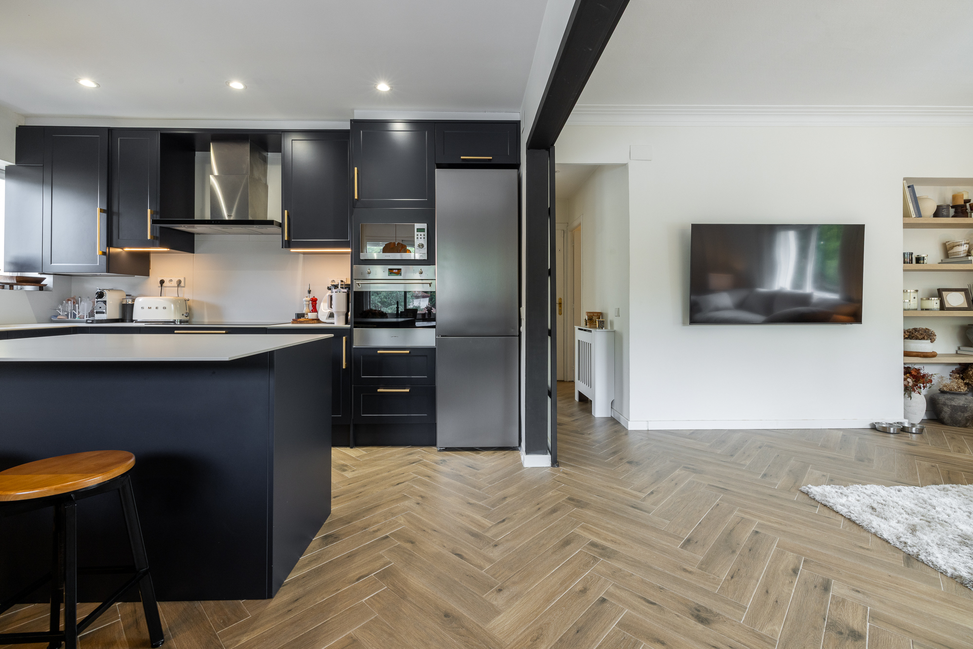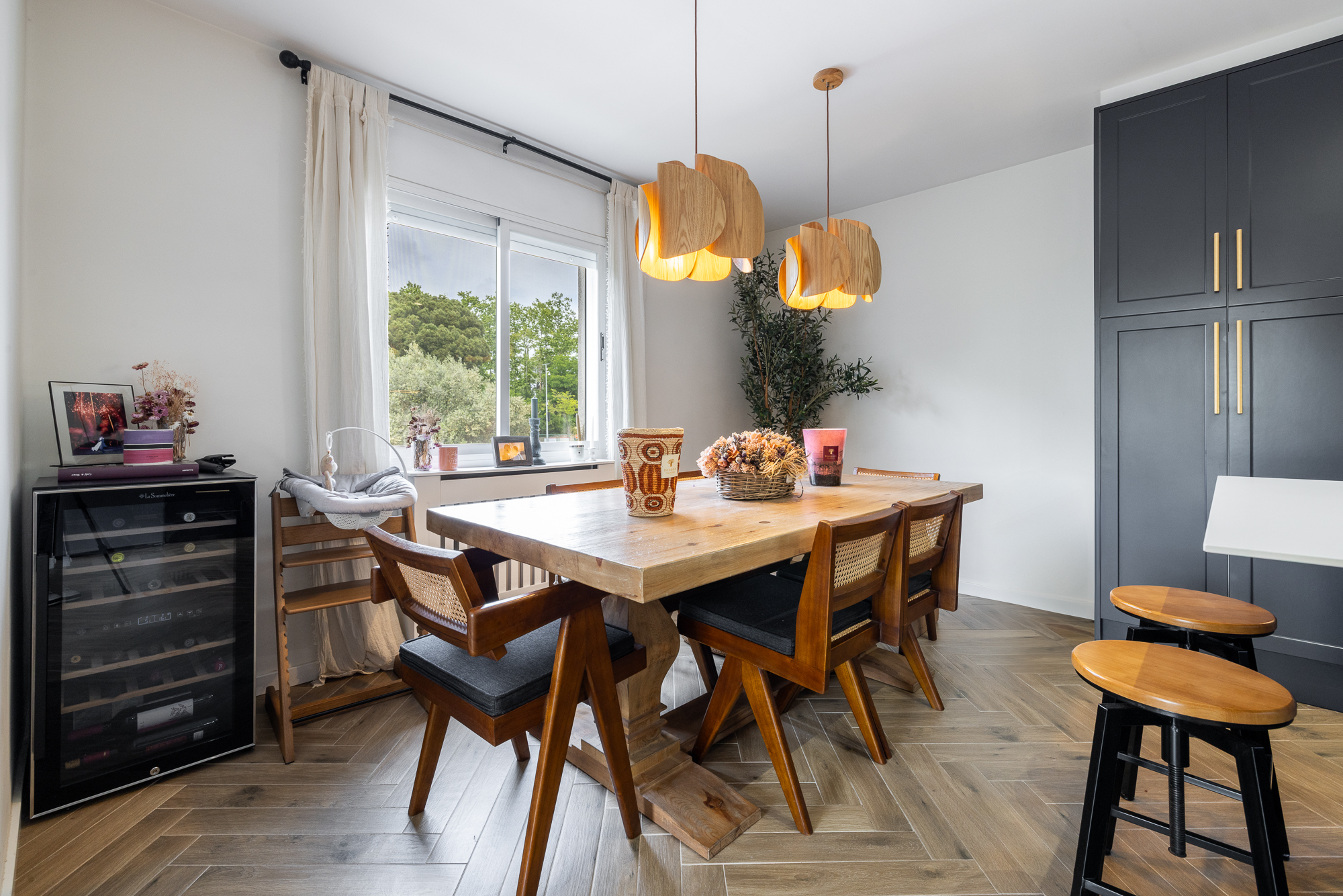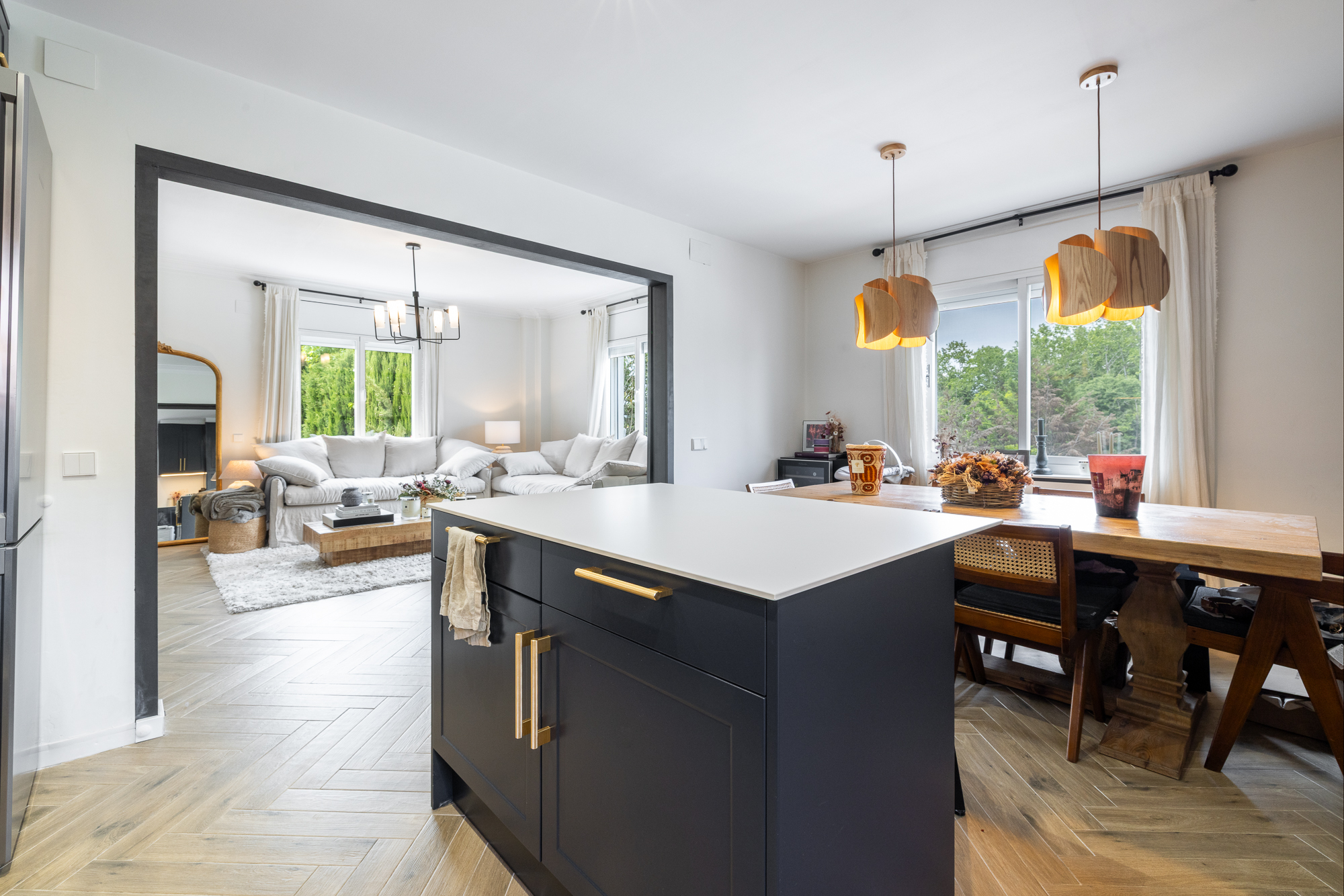 En la zona de día, un acogedor recibidor da la bienvenida y conduce a un amplio salón con comedor, conectado con la cocina mediante elegantes puertas correderas que permiten mantener los espacios integrados o separados según se necesite. Este espacio destaca por su luminosidad y por su distribución abierta, ideal para disfrutar en familia o con amigos.